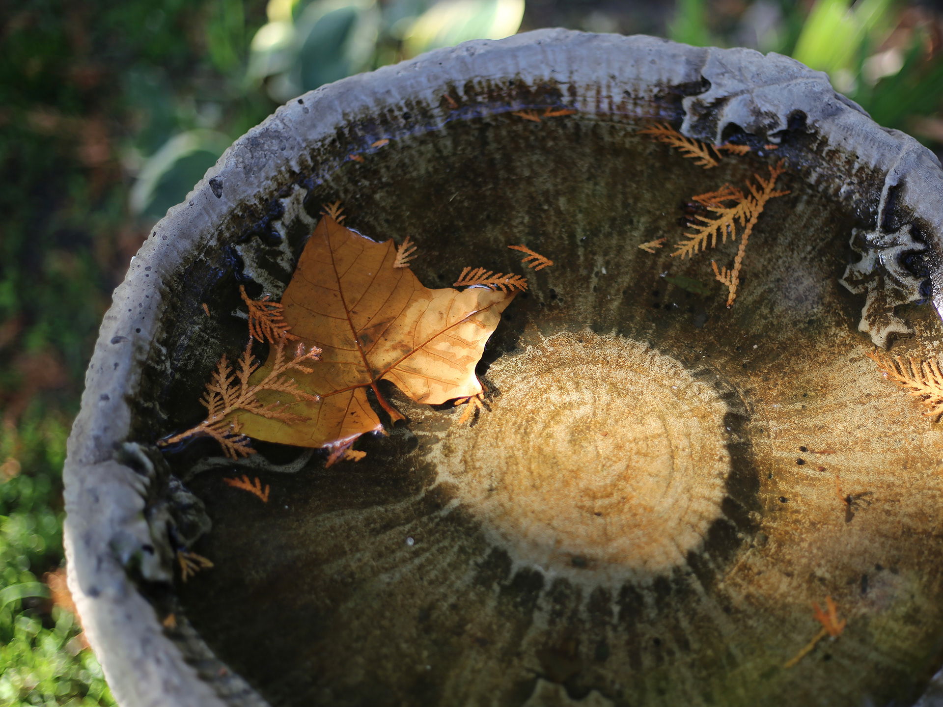 Photo of autumn leaves floating in a birdbath.